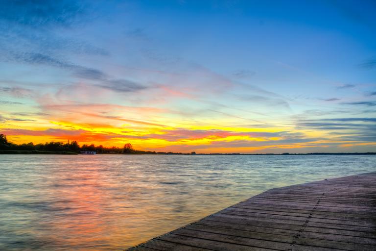 Keywords: lake sunset colorful water sky nature evening sun summer pier jetty netherlands zuidlaardermeer sunny reflection yellow orange