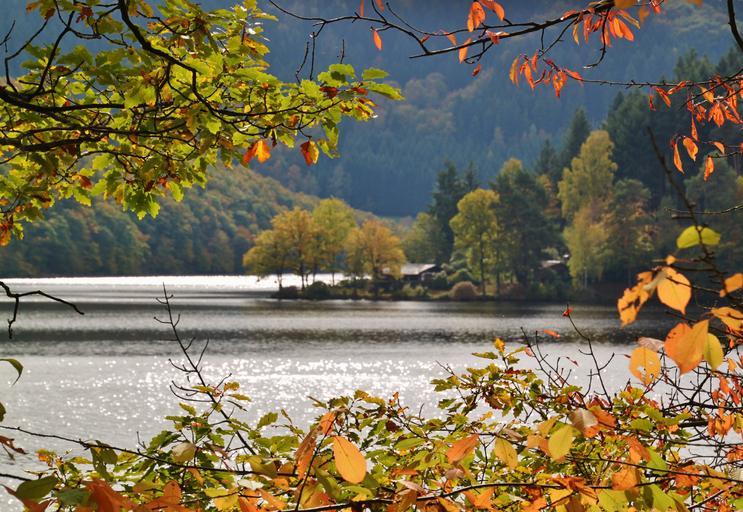 Keywords: lake waters boat house beech leaves leaves autumn aesthetic branches beech branches october trees log lighting sunlight fall foliage green hike eifel rursee upper lake germany landscape nature colorful autumn mood emerge