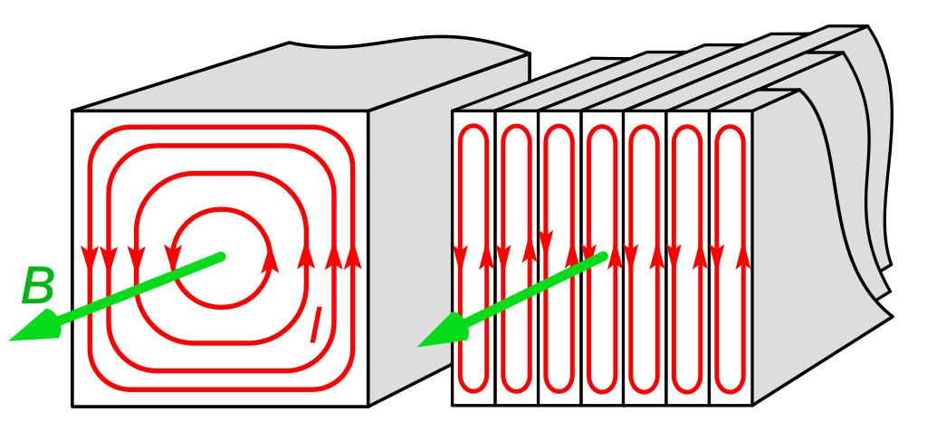 | Keywords: Laminated core eddy currents 2.svg laminated core in a transformer prevents power losses due to eddy current s The alternating current in the transformer's winding creates an alternating magnetic field <span style color green; >B green arrows</span> within the transformer's steel core Since the core is electrically conductive the field induces circulating loops of electric current in the core <span style color red; >red lines</span> called eddy current s due to Faraday's law of induction which flow in planes perpendicular to the field The current flowing through the resistance of the core dissipates energy as heat causing power losses To reduce the power losses instead of a solid core left many transformers use a laminated core right The core is made of a stack of thin steel laminations with a nonconductive coating on the surface The eddy currents can't cross from one lamination to the next so the only eddy currents that can flow must flow within the thickness of each individual lamination Since the magnitude of the current is proportional to the area enclosed by the loop this reduces the eddy currents greatly and thus the energy lost in the core In the diagram the magnetic field B and the eddy currents are shown in one direction; they actually reverse direction with each half-cycle of the alternating current 2016-02-03 own Chetvorno other fields + 26 d cc-zero Transformer schemas Eddy currents |