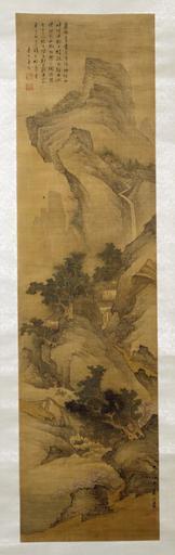 Keywords: Lan Shen - Landscape - Walters 3514.jpg Walters Art Museum artwork Creator Lan Shen en Near the middle of this narrow landscape a man sits on the upper story of a building A cascading waterfall above him disappears behind the mountain evidently flowing into a mist-laden stream the eventually meets the river at lower left The water courses isolate the pavilion and the narrow path that leads to it Far above is another cluster of buildings perhaps a Buddhist monastery so isolated that it exists on another plane altogether Lan Shen was the grandson and pupil of a far better-known painter Lan Ying 1585-after 1664 He must have been young when he painted this work in 1659 five years before Lan Ying's own Pine Hawk and Rock Walters 35 6 There is little indication in Lan Shen's landscape that he was following his grandfather in emulating the spare and reserved style of the Yüan Yuan-Dynasty masters Huang Gongwang and Zhao Mengfu 1659 ink colors silk paper cm 168 3 44 8 ; Image L 66 5/8 x W 17 13/16 in 169 2 x 45 3 cm ; W of scroll without knobs cm 63 5 accession number 35 14 13919 Liu Sung-pu Shanghai date and mode of acquistion unknown Panama-Pacific International Exposition China Pavilion San Francisco 1915 no 131 Henry Walters city Baltimore Walters Art Museum Henry Walters Acquired by Henry Walters 1915 text zh top left seal zh top left text zh bottom right place of origin China Walters Art Museum license 2D Chinese paintings in the Walters Art Museum Lan Shen 1650s landscape paintings 1659 paintings