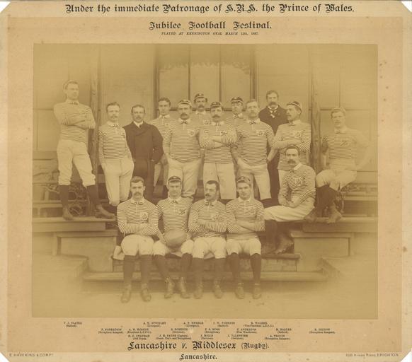 Keywords: Lancashire county rugby team 1887.jpg Lancashire County rugby union team that played Middlesex County at the Jubilee Football Festival 12 March 1887 Back row V J Slater Salford A H Stockley Liverpool A T Kemble Liverpool J W Roberts Salford R Walker Vice-President L C F C <br>Middle row J Robertson Boughton Rangers A N Hornby President L C F C S Roberts Swinton F S Ross Broughton C Anderton Free Wanderers H Eagles Salford R Seddon Broughton Rangers Front row H C Chapman Old Boys J H Payne Captain Cambridge University and Broughton J Mills Swinton J Valentine Swinton A Teggin Broughton Rangers 1887-03-12 Downloaded from https //www flickr com/photos/rugby_pioneers/9442118927/ Scanned by Frederic Humbert E Hawkin Co -- Probably Eliza Hawkins ca 1828-1887 but maybe George Thatcher 1839- See http //photohistory-sussex co uk/LancingPhotgrs htm Cropped version at File Lancashire county rugby team 1887 cropped jpg other versions PD-old-70-1923 Uploaded with UploadWizard 1887 in rugby union Lancashire County Rugby Football Union ImageNote 1 3225 1046 548 1180 4150 3648 2 Robert Seddon ImageNoteEnd 1 ImageNote 2 1838 918 347 274 4150 3648 2 Arthur Kemble ImageNoteEnd 2 ImageNote 3 1673 985 359 371 4150 3648 2 Samuel Roberts ImageNoteEnd 3 ImageNote 4 2787 1021 383 444 4150 3648 2 Harry Eagles ImageNoteEnd 4 ImageNote 5 1533 1745 481 900 4150 3648 2 John Payne ImageNoteEnd 5 ImageNote 6 1905 1806 432 748 4150 3648 2 Joe Mills ImageNoteEnd 6 ImageNote 7 2270 1745 432 784 4150 3648 2 James Valentine ImageNoteEnd 7 ImageNote 8 2702 1459 542 863 4150 3648 2 Alfred Teggin ImageNoteEnd 8 |