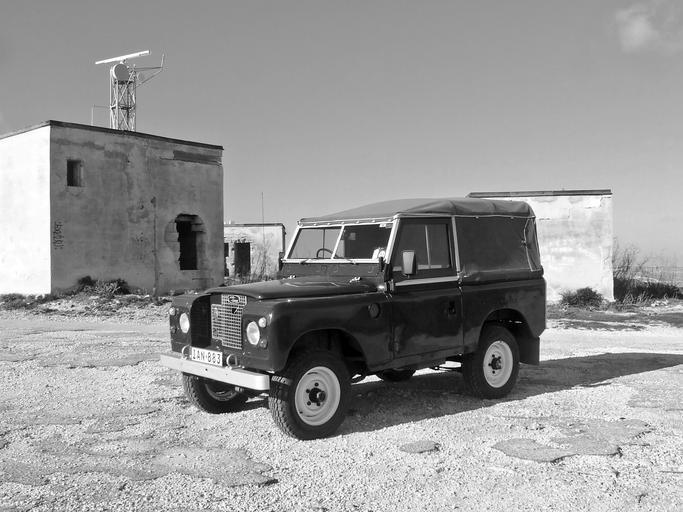 Keywords: land rover 4x4 off road old buildings radar station derelict rough terrain black white black white rough land texture environment