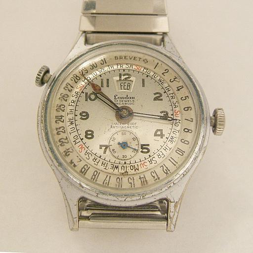 Keywords: Landau Date Hand Watch.JPG Landau date hand watch Manual 17 jewel movement by Eloga Co probably made in 1950s These early date watches could not automatically adjust for the different number of days in a month The second crown at 10 o'clock rotates the date chapter ring on the outer part of the face On the first of every month the wearer has to adjust this ring until the date hand points to date 1 The watch belongs to me and still works Additional information about it would be appreciated Own Photo taken March 30 2005 Chris Burks Chetvorno Wristwatches |
