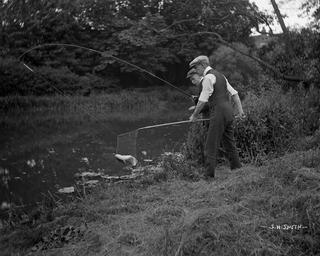 Keywords: Landing a chub YORYM-S71.jpg Two men on the bank of a river or canal with reeds and other plants at the water's edge One of them has a fishing rod the line of which runs to a large chub which lies in the landing net held by the second front man The man holding the fishing rod i depicted people depicted place 1900-1912 glass plate negative 125mm long edge x 100mm short edge institution Yorkshire Museum object history exhibition history credit line accession number YORYM S71 York Museums Trust image PD-old-70-1923 PD-US Images from The Sydney Harold Smith Collection Angling in England Uploaded with UploadWizard |