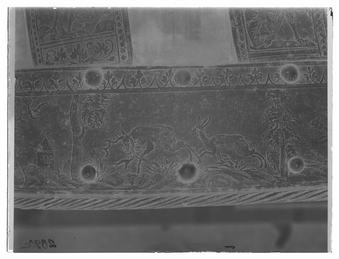 | Keywords: Ländpansar till hästrustning, har troligen tillhört Johan III, 1500-tal - Livrustkammaren - 10975-negative.tif LSH artwork sv Bestående av 45 plåtar i varierande storlek sammanfogade med nitar och på insidan kantband av sämskat läder Längs kanterna rader av nitar med kullriga mässingsskallar Formen välvd och formad efter hästens kropp med bredare bakparti Varje sida delas in i 14 rektagulära fält klädda med mörkrött siden Kanter och flätverk med på den blanka utsidan ett heltäckande etsat mönster iform av nertill jaktscener och på banden helfigurbilder på män i olika typer av rustning varav några med sköldar Mellan figurbilderna runda medaljonger med byster av män och kvinnor i antikiserande kläder Pansarets övre del består av ett separat långsmalt stycke med framtill dekor av tätt rankverk och baktill format till en liggande hundliknande drake med lång ringlande svans uppspärrat gap och uppåtpekande öron Kroppen täckt av etsade lövliknade fjäll djurets längd 720 mm Insidan brunsvart och ojämn med tyliga slagmärken Längs nedre kanterna 20 mm breda band av brungult sämskat läder original caption century 16 velvet Färg mörkt röd material sammet - brass - steel - leather Färg brungul material läder g 8600 size mm 890 650 340 LRK Johan III av Sverige Tre Konungar på Åbo slott 1993 Björneborg - Johans stad Satakunta Museum Björneborg/Pori 2008 Trofast - hov och tass i kunglig tjänst 2010-2011 Livrustkammaren Trogna vänner - Kungliga hästar och hundar 2011-2012 Museiverket/Finlands nationalmuseum place of origin original filename LN_E02917 59504 inventory number LRK 22862 10975 CC0 Ländpansar till hästrustning har troligen tillhört Johan III 1500-tal - Livrustkammaren - 10975 tif <gallery caption Different images of same object > File Ländpansar till hästrustning troligen tillhörigt Johan III 1500-tal - Livrustkammaren - 79460 tif File Ländpansar till hästrustning troligen tillhörigt Johan III 1500-tal - Livrustkammaren - 2415 tif File Ländpansar till hästrustning troligen tillhörigt Johan III 1500-tal - Livrustkammaren - 36659 tif File Ländpansar till hästrustning troligen tillhörigt Johan III 1500-tal - Livrustkammaren - 70895 tif </gallery> <gallery caption Related objects > File Manpansar möjligen tillhörigt Johan III 1500-talets mitt - Livrustkammaren - 19537 tif LRK 22860 File Manpansar möjligen tillhörigt Johan III 1500-talets mitt - Livrustkammaren - 36657 tif LRK 22860 File Manpansar möjligen tillhörigt Johan III 1500-talets mitt - Livrustkammaren - 62337 tif LRK 22860 File Bogpansar till hästrusning troligen tillhörigt Johan III 1500-tal - Livrustkammaren - 35526 tif LRK 22861 File Manpansar möjligen tillhörigt Johan III 1500-talets mitt - Livrustkammaren - 70899 tif LRK 22860 File Bogpansar till hästrusning troligen tillhörigt Johan III 1500-tal - Livrustkammaren - 44085 tif LRK 22861 File Bogpansar till hästrusning troligen tillhörigt Johan III 1500-tal - Livrustkammaren - 79454 tif LRK 22861 File Manpansar möjligen tillhörigt Johan III 1500-talets mitt - Livrustkammaren - 79458 tif LRK 22860 File Manpansar möjligen tillhörigt Johan III 1500-talets mitt - Livrustkammaren - 53776 tif LRK 22860 File Manpansar möjligen tillhörigt Johan III 1500-talets mitt - Livrustkammaren - 45215 tif LRK 22860 File Manpansar möjligen tillhörigt Johan III 1500-talets mitt - Livrustkammaren - 10973 tif LRK 22860 File Manpansar möjligen tillhörigt Johan III 1500-talets mitt - Livrustkammaren - 28096 tif LRK 22860 File Utställningsbild sadlar hästrustningar mm - Livrustkammaren - 77173 tif LRK 22861 File Manpansar möjligen tillhörigt Johan III 1500-talets mitt - Livrustkammaren - 2413 tif LRK 22860 File Manpansar möjligen tillhörigt Johan III 1500-talets mitt - Livrustkammaren - 35519 tif LRK 22860 </gallery> |