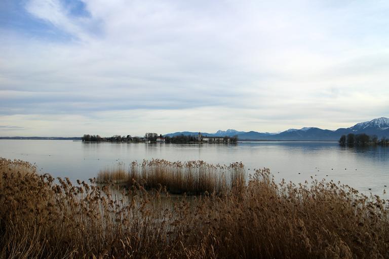 Keywords: landscape chiemsee reed island ladies island sky blue clouds distant wide view distance distant view vision target overview