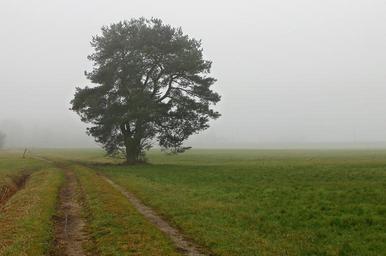 Keywords: landscape fog haze tree pine away green meadow grass mood nature slurry trist lonely