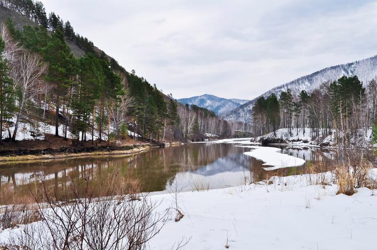Keywords: forest snow river water mountains trees nature deserted