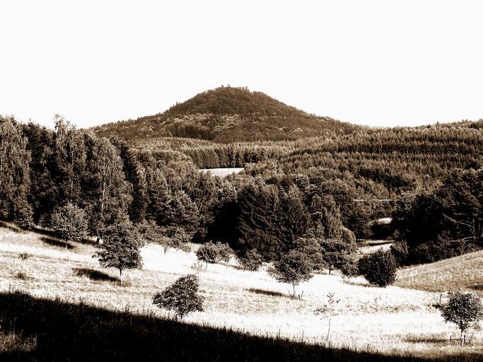 Keywords: landscape forest trees woods mountain summer spring nature outside outdoor valley black and white sepia