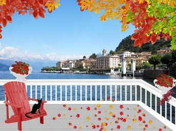 Keywords: landscape lake italy lake como patio leaves fall adirondack chair flowers jardiniere balustrade black cat