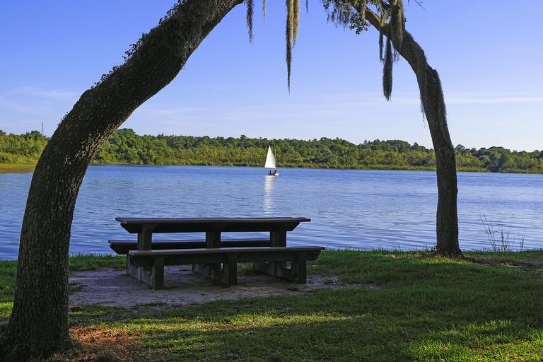 Keywords: landscape lake park field boat sailing lawn bench wood nature diversity florida usa