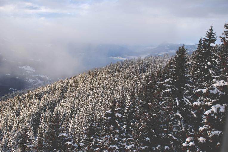 Keywords: landscape mountains hills trees peaks fog clouds sky outdoors nature