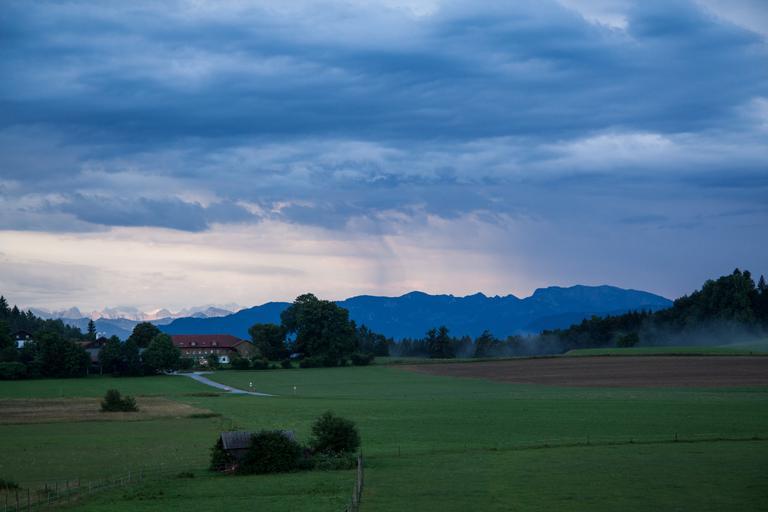 Keywords: landscape mountains upper bavaria evening grey blue green wide angle clouds rain rain clouds sky nature hair dryer pasture