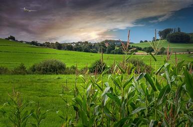Keywords: landscape nature lichtspiel atmospheric clouds sun meadow summer field aircraft