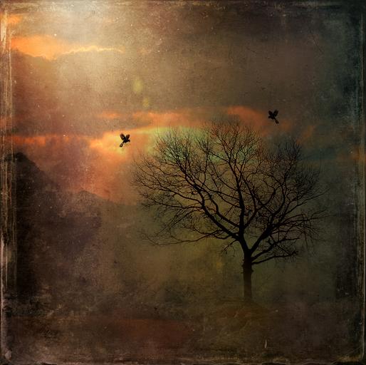 Keywords: landscape nature mystical sunrise sunset dig birds sky clouds tree mountains loneliness painting digital art composing