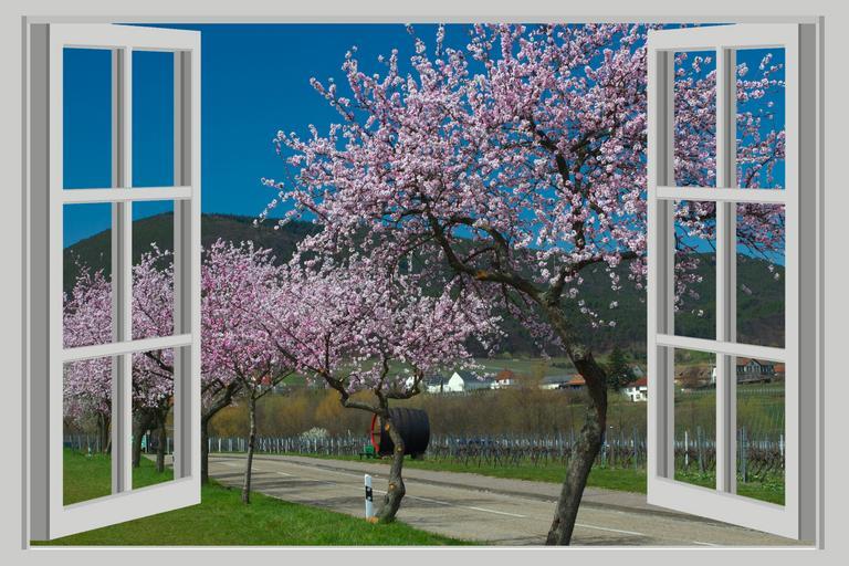 Keywords: landscape panorama spring flowers scenic view nature mood environment window almonds almond blossom pink