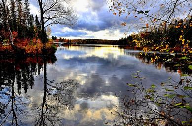 Keywords: landscape reflections fall leaves water lake sky trees clouds colors québec