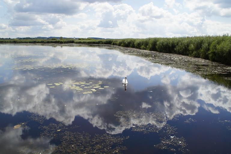 Keywords: landscape spring lake nature reserve nature moorland wetland summer grasses reed silted nature conservation southern germany sky clouds summer landscape baden württemberg mirroring water lake tributary waters swan