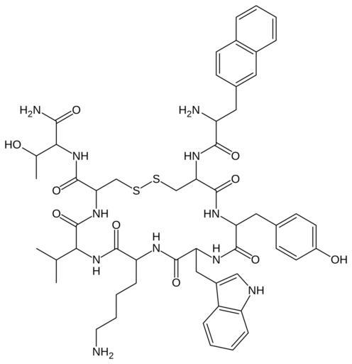 Keywords: Lanreotide.svg Skeletal formula of lanreotide Created using http //www acdlabs com/download/chemsk html ACD/ChemSketch 10 0 and Inkscape <br>This structure does not provide stereochemistry information Own 2007-03-10 Fvasconcellos Hormonal agents Cyclic peptides |