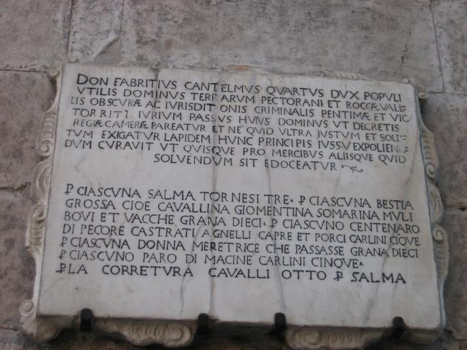 | Keywords: Lapide Taverna Popoli.jpg Popoli it wikipedia 2008-11-01 Claro48 wikipedia it Claro48 Original upload log it wikipedia Lapide_Taverna_Popoli jpg wikitable - 2008-11-01 20 27 2592×1944× 1217040 bytes Claro48 <nowiki>Autore My own production free use Descrizione Lapide posta sulla facciata esterna della taverna del XIV secolo a Popoli in provincia di Pescara in Abruzzo Italy Nella stessa vengono riportati i compensi da corrsispondere al momento del transito p</nowiki> Plaques in Popoli Latin inscriptions in Abruzzo Taverna Ducale dei Cantelmo Popoli |