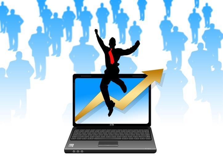 Keywords: laptop monitor businessman group management style leadership margin success arrow top blue green upward internet www computer personal notebook aspiring successful profit victorious win boom