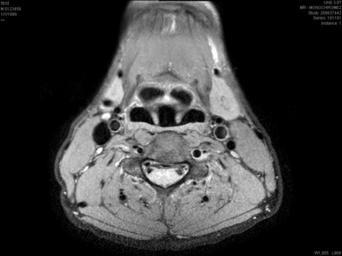 Keywords: Larynx PDW nima.jpg A not so good view of the larynx scanned by myself using an Achieva Philips 3T MRI system The image is a Proton Density weighted using the scanner's own PDW BB M2D CLEAR protocol A medium sense flex coil was attached to the patient Own 2008 Zereshk Larynx Magnetic resonance imaging