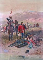 | Keywords: Last Sleep of the Brave.jpg en Prev - 1 of 1 results - Next » 'Last Sleep of the Brave' Isandlwana Zulu War 1879 Oleograph after Alphonse de Neuville 1881 This work depicts a patrol from the 17th Duke of Cambridge's Own Lancers discovering the bodies of Lieutenant Teignmouth Melvill and Lieutenant Nevill Josiah Aylmer Coghill 24th 2nd Warwickshire Regiment of Foot who were both killed attempting to save the Queen's Colour of the 1st Battalion at the Battle of Isandlwana on 22 January 1879 The depiction of the 17th Lancers is however anachronistic as when the bodies were retrieved the lancers had yet to leave England for South Africa NAM Accession Number NAM 1956-02-284-1 Copyright/Ownership National Army Museum London Location National Army Museum Study Collection Browse related themes Last Stands and Forlorn Hopes Death or Glory 17th/21st Lancers 1879 http //www nam ac uk/online-collection/detail php acc 1956-02-284-1 Alphonse de Neuville PD-Art Uploaded with UploadWizard British Lancers Regiments Anglo-Zulu War |