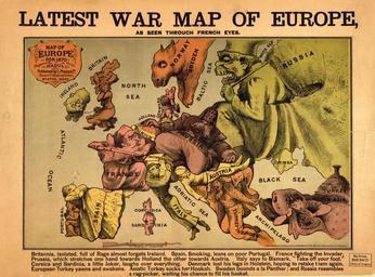 | Keywords: Latest War Map of Europe 1870.jpg en A French satirical cartoon map of Europe in 1870 Britannia Full of Rage Almost Forgets Ireland Spain Smoking Leans On Poor Portugal France Fighting the Invader Prussia Which Stretches One Hand Towards Holland the Other Towards Austria Italy Says to Bismark Take Off Your Foot Corsica and Sardinia A Little Joker Laughs Over Everything Denmark Lost His Legs in Holstein Hoping to Retake Them Again European Turkey Yawns and Awakens Asiatic Turkey Sucks Her Hookah Sweden Bounds A La Panther; and Russia Resembles A Rag Picker Waiting His Chance to Fill His Basket 1870 LOC-map 2010587001 Creator Paul Hadol Custom license marker 2013 03 11 PD-old-100 Old maps of Europe 1870 cartoons 1870 maps Personifications of nations Paul Hadol Satirical maps Personifications of Russia Personifications of Spain |