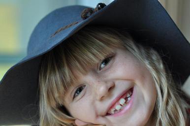 Keywords: laugh child girl face happy human blond hat cute eyes gap milk teeth