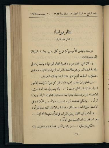 | Keywords: Layla, Issue 7, April 15, 1924 WDL2845.jpg Artwork ru Хассун Паулина fr Hassoun Paulina en Hassoun Paulina zh 哈桑 琳 pt Hassoun Paulina ar حسون بولينا es Hassoun Paulina ru Лейла выпуск 7 15 ап еля 1924 г fr Layla numéro 7 15 avril 1924 en Layla Issue 7 April 15 1924 zh Layla ,第 7 ,1924 年 4 15 日 pt Layla Edição 7 15 de abril de 1924 ar ليلى، العدد 7، 15 نيسان 1924 ru <i> Лейла </i> был пе вым женским жу налом опубликованным в И аке Этот жу нал впе вые выпущенный в 1923 году был посвящен новейшим полезным воп осам связанным с наукой искусством лите ату ой социологией и в частности воспитанию и обучению девочек здо овью семьи и д угим воп осам касающимся ведения домашнего хозяйства После установления национального п авительства в И аке появилось несколько жу налов и газет посвященных женским воп осам <i> Лейла </i>ознаменовал собой за ождение женской п ессы в И аке этот жу нал считается одним из факто ов повлиявших на возникновение и фо ми ование а абского женского движения Жу нал выпускался под девизом а пути к воз ождению и акской женщины и асп ост анял новости культу ы об азования и воп осов касающихся семьи а также возглавлял кампанию за освобождение женщин В числе его азделов были следующие Испытание п авом алоговые новости Уголок домохозяйки Забавные новости Кольца магических ст ок и д угие В жу нале также освещались воп осы касающиеся исследований в области медицины лите ату ы и поэзии и были опубликованы п оизведения известных и акских поэтов аль-Расафи и аль-Захави Одной из наиболее значимых статей опубликованных в жу нале была статья вышедшая в Выпуске 6 от 15 мая 1924 года об ащенная к Уч едительному соб анию И ака с п изывом п едоставить женщинам их законные п ава Всего было выпущено <i> </i>20 выпусков жу нала Лейла В последнем выпуске от 15 августа 1925 года соде жалась печальная статья в кото ой читателям жу нала объяснялось сложное финансовое положение жу нала Вско е после этого владелица жу нала Паулина Хассун покинула И ак и жу нал п ек атил свое существование <br>Жу налы для женщин fr <i>Layla</i> a été le premier magazine féminin publié en Irak Lancée en 1923 la revue traitait de sujets nouveaux et utiles dans des domaines aussi variés que la science l'art la littérature la sociologie mais aussi l'éducation des enfants et des jeunes filles la santé familiale et d'autres sujets relevant de l'économie domestique L'établissement d'un régime républicain en Irak a été suivi par l'apparition de plusieurs journaux et magazines traitant de problématiques féminines <i> Layla </i>a marqué les débuts de la presse féminine en Irak et le magazine est considéré comme un des facteurs de l'émergence du mouvement des femmes arabes Publié sous le bandeau Sur la voie de la renaissance de la femme irakienne le magazine diffusait des informations à propos de culture d'éducation et de la famille et a également pris la tête d'une campagne de libération de la femme Ses éditoriaux avaient pour titre Le creuset du Droit Actualités fiscales Le coin des femmes au foyer Informations insolites Anneaux de cordes magiques etc Le magazine s'intéressait également à la recherche médicale à la littérature et à la poésie et a publié des oeuvres des célèbres poètes irakiens al-Rasafi et al-Zahawi L'un des plus importants articles parus dans le magazine a été l'éditorial du numéro 6 datant du 15 mai 1924 adressé à l'Assemblée constituante irakienne et lui demandant d'accorder leurs droits aux femmes Layla<i> </i>n'a connu que 20 parutions Son dernier numéro daté du 15 août 1925 comprend un article au ton triste expliquant aux lecteurs la situation financière difficile du magazine Peu de temps après la propriétaire Paulina Hassoun a quitté l'Irak et la revue a cessé de paraître <br>Périodiques féminins en <i>Layla</i> was the first women's magazine to be published in Iraq Launched in 1923 the magazine dealt with new and useful matters related to science art literature sociology and in particular to child-rearing and the education of girls family health and other matters pertaining to home economics The establishment of national rule in Iraq was followed by the emergence of several magazines and newspapers dealing with women's issues <i>Layla</i> marked the beginnings of the women's press in Iraq and the magazine is credited with being one of the factors in the emergence of the Arab women s movement Published under the banner On the Way to Revival of the Iraqi Woman the magazine disseminated news about culture education and family affairs as well as led a campaign
