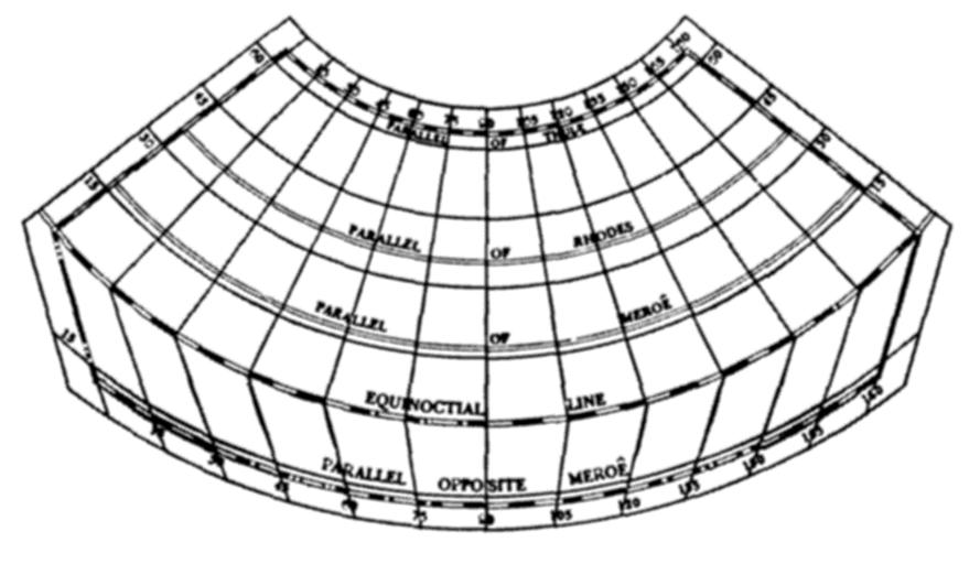 | Keywords: Layout of Ptolemys 1st Projection.png en A blank grid for construction of maps on Ptolemy's first modified conic projection Cropped from larger image Text removed <blockquote>Fig 6 13 a A reconstruction of Ptolemy's conic projection suggested for the construction of a map of the habitable world after a sixteenth-century copy courtesy Enoch Pratt Free Library </blockquote> 2014 Enoch Pratt Free Library via https //cnx org/contents/1Aah2uGj 1/Chapter-06-Cartography Ch 6 Cartography at OpenStax CNX Enoch Pratt; Christopher Houser other versions <gallery> File Ptolemaic projections png full image </gallery> cc-by-4 0 LlywelynII Map projections Ptolemy's first projection Christopher Houser OpenStax CNX Enoch Pratt |