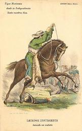 | Keywords: Lazador insurgente Mexique.jpg fr Gravure du XIXème siècle représentant un insurgé mexicain pe en A Mexican ranchero removing an officer from the front of his battalion with a lasso during the Mexican wars of independence from the book Costumes civils militaires et réligieux du Mexique Belgium 1828 http //img383 imageshack us/my php image i826406ws jpg début XIXème siècle Creator Claudio Linati PD-old-100 Cavalry in Latin America history Charro Cavalry of Mexico Claudio Linati | ||||