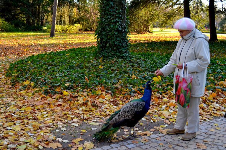 Keywords: lazienki park poland park warsovie warsaw peacock leaves bird woman old woman senior