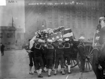 Keywords: blackandwhite monochrome black and white LC-DIG-GGBAIN-16189: Intervention at Veracruz, Mexico, 1914. Photograph shows sailors putting a flag draped casket on a caisson in New York City, before the National Memorial Service on May 11, 1914 in honor of the seamen and marines who were killed in Veracruz, Mexico during the Mexican Revolution. . Courtesy of the Library of Congress. (5/8/2015). LC-DIG-GGBAIN-16189: Intervention at Veracruz, Mexico, 1914. Photograph shows sailors putting a flag draped casket on a caisson in New York City, before the National Memorial Service on May 11, 1914 in honor of the seamen and marines who were killed in Veracruz, Mexico during the Mexican Revolution. . Courtesy of the Library of Congress. (5/8/2015).