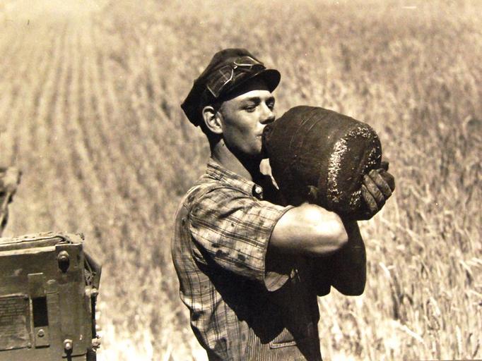 | Keywords: outdoor LC-USF34-57979-D:  Scandinavian tractor combine driver, drinking water out of a jug in the field where they were harvesting wheat on the Schnitzler corporation ranch.  This boy came to the Schnitzler ranch from South Dakota where he lives and harvested the earlier wheat crop there before coming for the Montana harvest season at Froid, Montana.  Photographed by Marion Post Wolcott, August 1941.  Office of War Information Collection. (9/11/2015). LC-USF34-57979-D:  Scandinavian tractor combine driver, drinking water out of a jug in the field where they were harvesting wheat on the Schnitzler corporation ranch.  This boy came to the Schnitzler ranch from South Dakota where he lives and harvested the earlier wheat crop there before coming for the Montana harvest season at Froid, Montana.  Photographed by Marion Post Wolcott, August 1941.  Office of War Information Collection. (9/11/2015). |