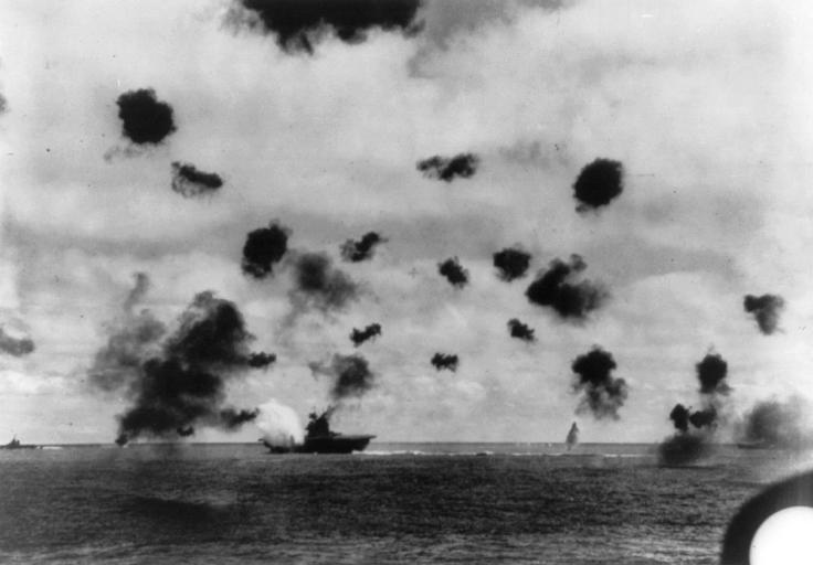 | Keywords: blackandwhite monochrome black and white LC-USZX62-15191:    Battle of Midway, June 1942.  USS Yorktown (CV-5) is hit on the port side, amidships, by a Japanese Type 91 aerial torpedo during the mid-afternoon attack by planes from the carrier Hiryu, 4 June 1942.  Photographed from USS Pensacola (CA-24).  Yorktown is heeling to port and is seen at a different aspect than in other views taken by Pensacola, indicating that this is the second of the two torpedo hits she received.  Note very heavy anti-aircraft fire.  Also at the National Archives as 80-G-414423.  (7/2/2015). LC-USZX62-15191:    Battle of Midway, June 1942.  USS Yorktown (CV-5) is hit on the port side, amidships, by a Japanese Type 91 aerial torpedo during the mid-afternoon attack by planes from the carrier Hiryu, 4 June 1942.  Photographed from USS Pensacola (CA-24).  Yorktown is heeling to port and is seen at a different aspect than in other views taken by Pensacola, indicating that this is the second of the two torpedo hits she received.  Note very heavy anti-aircraft fire.  Also at the National Archives as 80-G-414423.  (7/2/2015). |