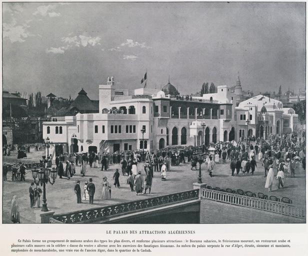 | Keywords: Le Palais des attractions algériennes, Exposition Universelle 1900.jpg Palace of Algerian attractions at the 1900 Paris World Fair In this cluster of buildings the visitor was to discover several types of Algerian dwellings It housed a diorama large painted landscape animated by light and sound effects a stereorama and a few restaurants and cafes There was also a street of Alger in the center of the building which was supposed to give the visitor an idea of what the streets of the city looked like at the time The French Army had captured Algiers in 1830 but the conquest of the country was slow 1900 photographic print 19 7 x 27 cm Institution Brown University Library object history exhibition history credit line Published in Neurdein frères and Maurice Baschet Le panorama Exposition universelle Paris Librairie d'Art Ludovic Baschet 1900 accession number 1303836999625001 PD-old Images of Paris from the Brown University Library Le panorama Exposition universelle Pavillon de l'Algérie de l'Exposition Universelle 1900 |