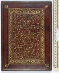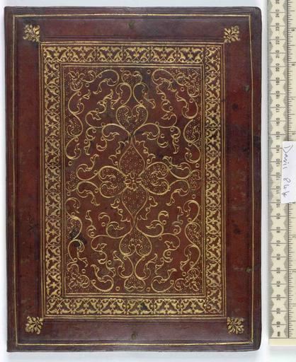 Keywords: Le panneaux d'ornaments - Suite de 21 estampes - Upper cover (Davis844).jpg Style All over design Panel design; Caption Upper cover; Colour Brown; Edge Sprinkled red exhibition history Decorative Technique Tooled in gold; Cover Material Goatskin includes morocco turkey etc Macchi states; Venice c1560 Bound by the Leermaureskenmeister I Schunke Venezianische Renaissance- Einbände p 182-183 About 30 the known works of this bindery F Malaguzzi Preziosi in biblioteca p 405-409 See also not digitised Add Ms 41145 Eg Ms 757 object history Text 16c; s l ; Unspecified object type Cc-zero place of creation Binding Italy place of discovery Anthony Hobson Paul Culot Italian and French 16th-century bookbindings Brussels 1991 Laura Nuvoloni Commissioni dogal bookbindings in the British Library 'For the love of binding' Studies in bookbinding history presented to Mirjam Foot 2000 pp 81-109 fig 16 M M Foot the Henry Davis Gift vol III British Library image http //www bl uk/catalogues/bookbindings/LargeImage aspx RecordId 020-000005050 ImageId ImageId 42130 Copyright BL Le panneaux d'ornaments - Suite de 21 estampes Uploaded with GWToolset Le panneaux d'ornaments - Suite de 21 estampes - Upper cover Davis844 http //www webarchive org uk/bldatasets/bindings/6708_4 jpg Bookbinding 16th-century bookbinding British Library Bookbindings