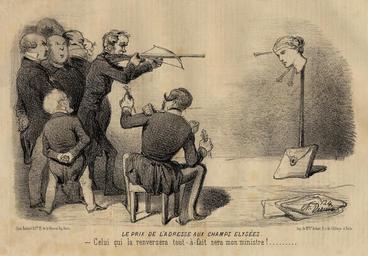 | Keywords: Le prix de l'adresse aux Champs-Elysées.jpg  The price of the address on the Champs-Elysées<br> - Whoever knocks it off will be my minister Louis-Napoléon Bonaparte sits on a chair as men who wish to become his minister try to knock the head of a statue of Marianne off of a pole with a cross-bow 1848-1851 lithograph Institution Brown University Library object history exhibition history credit line Le Charivari accession number 113199460734640 PD-old Lithographs of Paris Images of Paris from the Brown University Library Caricatures of Napoleon III Caricature of Marianne Bow and arrow in art Caricatures of politicians of France Odilon Barrot Caricatures of Adolphe Thiers Crossbows in art Louis Véron |