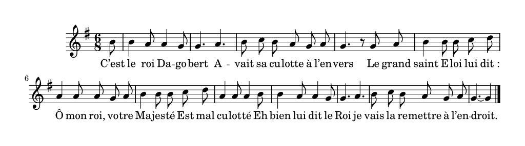 | Keywords: Le Roi Dagobert.svg Le Roi Dagobert fr LilyPond source <source lang text > \version 2 14 0 \header tagline f \score \relative c \key g \major \time 6/8 \partial 8 \autoBeamOff b8 b4 a8 a4 g8 g4 a b8 c b a g a g4 r8 g a b4 b8 b c d a4 a8 a g a b4 b8 b c d a4 a8 a4 b8 b4 a8 a4 g8 g4 a b8 c b a g a g4 ~ g4 \bar \addlyrics C ™est le roi Da -- go -- bert A -- vait sa cu -- lotte à l ™en -- vers Le grand saint E -- loi lui dit_ Ô mon roi vo -- tre Ma -- jes -- té Est mal cu -- lot -- té Eh bien lui dit le Roi je vais la re -- mettre à l ™en -- droit \midi \context \Score tempoWholesPerMinute ly make-moment 100 4 \layout </source> <score vorbis 1 > \relative c \key g \major \time 6/8 \partial 8 \autoBeamOff b8 b4 a8 a4 g8 g4 a b8 c b a g a g4 r8 g a b4 b8 b c d a4 a8 a g a b4 b8 b c d a4 a8 a4 b8 b4 a8 a4 g8 g4 a b8 c b a g a g4 ~ g4 \bar \addlyrics C ™est le roi Da -- go -- bert A -- vait sa cu -- lotte à l ™en -- vers Le grand saint E -- loi lui dit_ Ô mon roi vo -- tre Ma -- jes -- té Est mal cu -- lot -- té Eh bien lui dit le Roi je vais la re -- mettre à l ™en -- droit \midi \context \Score tempoWholesPerMinute ly make-moment 100 4 </score> valid SVG 2015-03-02 s fr Page Chansons populaires enfantines djvu/24 author other versions <gallery> File Le Roi Dagobert svg File Le Roi Dagobert mid File Le Roi Dagobert oga </gallery> Uploaded with UploadWizard Songs in French Sheet music of traditional origin |