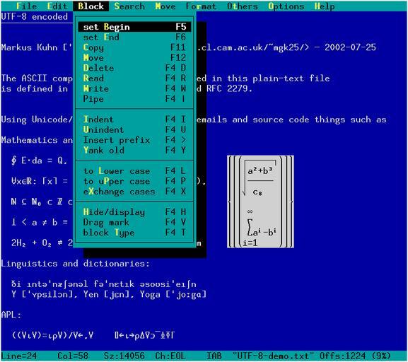 Keywords: Le-utf-Rblock.png en LE editor screenshot with an UTF-8 example text and a rectangular block selected own screenshot Alexander Lukyanov 2008-08-19 Check categories 2008 November 19 en wikipedia LE_ text_editor Software Screenshots of free software Text user interface C++ |