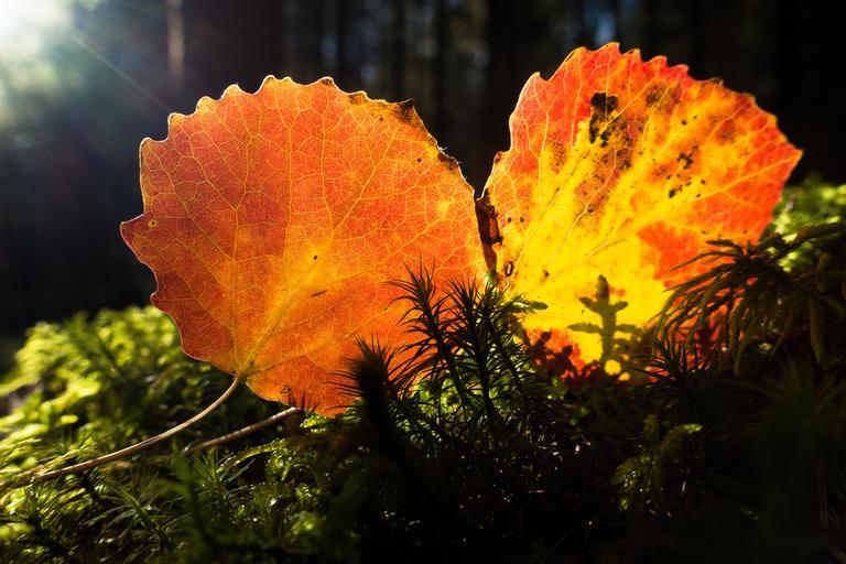 Keywords: leaf alder colorful yellow orange autumn light moss forest floor forest macro