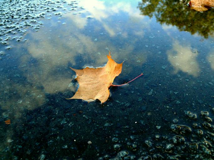 Keywords: leaf rain puddle autumn mirroring wet blue sky asphalt