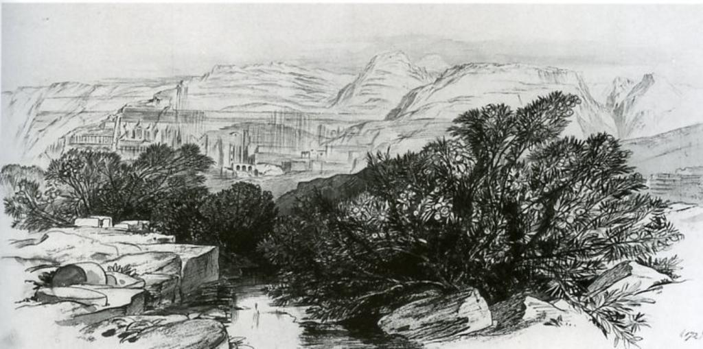 | Keywords: Lear petra wadi bushes 1858.jpg Petra rosy blossom in hot ravine Black and brown pen and ink over black chalk with grey wash and white chalk highlight Pétra fleurs roses en ravine chaude Crayon et stylo noir et brun sur craie noire avec détails gris et à la craie blanche Gen Ed Glenn Markoe Petra Rediscovered Lost City of the Nabataeans Thames Hudson Ltd 2003 ISBN 0500051267 1858 Creator Edward Lear PD-old author died more than 70 years ago PD-old-100 Petra in art Sketches Wadis in Jordan Landscape paintings by Edward Lear |