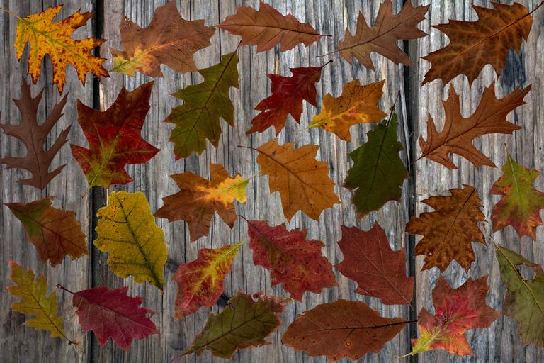 Keywords: leaves fall leaves colorful colored fall color emerge fall foliage composition oak leaves wood background