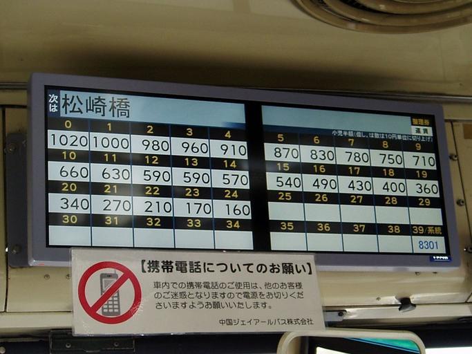 | Keywords: LECIP Digital fare display OBC-Vision 1.jpg en Digital fare display OBC-Vision producted by LECIP use by Chugoku JR Bus ja レシップ製液晶運賃表示器 OBC-Vision 中国ジェイアールバスで使用されている Photo by Cassiopeia_sweet Cassiopeia_sweet 2008-06-08 250px250px Information boards on buses Chugoku JR Bus No cellphone signs Red circle with right slash Signs in Japan Japanese language signs |