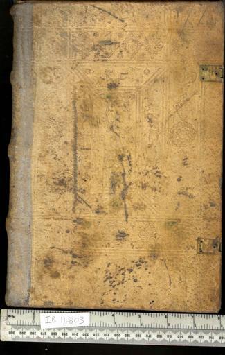 | Keywords: Lectura in Johannem Duns Scotum super libro primo-Sententiarum - Upper cover (IB140803).jpg Style Christs head motif Deer motif Dog motif Panel design Single tools design; Caption Upper cover; Colour White / cream; Edge Unspecified exhibition history Decorative Technique Tooled in blind; Cover Material Pigskin alum tawed Wooden boards Traces of 2 pairs of clasps Spine painted white at a later date Doublures of ink ms on vellum Ink ms note on first page of text indicates ownership of Carmelites of Abensberg object history Text 1498; Tubingen; Unspecified object type Cc-zero place of creation Binding Germany place of discovery Unspecified British Library image http //www bl uk/catalogues/bookbindings/LargeImage aspx RecordId 020-000008558 ImageId ImageId 43884 Copyright BL Lectura in Johannem Duns Scotum super libro primo Sententiarum Uploaded with GWToolset Lectura in Johannem Duns Scotum super libro primo Sententiarum - Upper cover IB140803 http //www webarchive org uk/bldatasets/bindings/9178_3 jpg Bookbinding 16th-century bookbinding British Library Bookbindings |