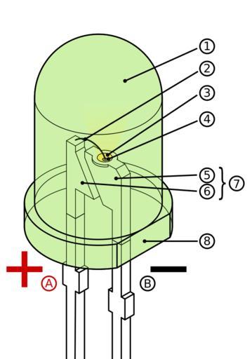 | Keywords: LED, 5mm, green (int).svg  en Drawing of a 5mm round LED the normal type with numerical labels see below for the key own Inductiveload 2009-11-04 Other versions/LED 5mm green Key wikitable Label English Castellano - A Anode Ánodo - B Cathode Cátodo - 1 Epoxy lens/case Encapsulado/lente epóxico - 2 Wire bond Contacto metálico - 3 Reflective cavity Cavidad reflectora - 4 Semiconductor die - 5 Anvil Yunque - 6 Post Plaqueta - 7 Leadframe Soporte Conductores - 8 Flat spot Borde plano plano LED schemas SVG diodes |