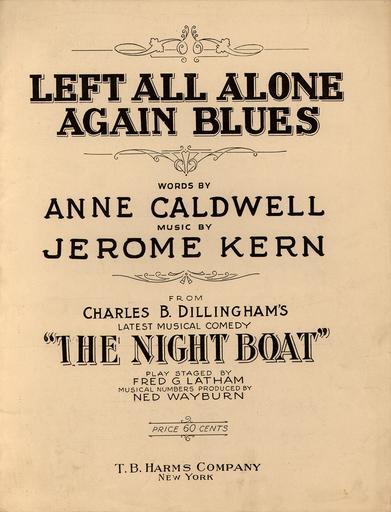 | Keywords: Left All Alone Again Blues 1.jpg Left All Alone Again Blues_ 1 jpg en Sheet music of Left All Alone Again Blues from the Broadway musical The Night Boat Page 1 of 5 Duke University Libraries Historic American Sheet Music collection http //library duke edu/digitalcollections/hasm b0820/ 1920 Music by Jerome Kern lyrics by Anne Caldwell Published by T B Harms Company New York 1945 Sheet music from The Night Boat Sheet music covers of New York City | ||||