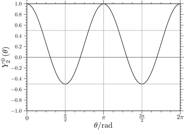 | Keywords: Legendre(2,0) Cos(th).svg Legendre Polynomial of cos with l 2 m 0 Own Inkscape 2007-05-24 Legendre Polynomial of cos with l 2 m 0 - Equation <math>Y_0 2 \left \theta \right \frac 1 2 \left 3 \cos 2 \left \theta \right - 1 \right </math> - Co-ordinate System Cartesian - X Range 0 2 - Y Range -1 1 - 2 - colspan 2 Points of Interest in this Range - Maxima <math>\left 0 1 \right \ </math> <math>\left \pi 1 \right \ </math> <math>\left 2\pi 1 \right \ </math> - Minima <math>\left \frac \pi 2 -\frac 1 2 \right </math> <math>\left \frac 3\pi 2 -\frac 1 2 \right </math> - Roots <math>\cos \theta \pm \frac 1 \sqrt 3 </math> Spherical harmonics |